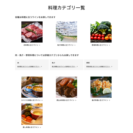 個別の料理名だけでなく、大まかな料理ジャンルから料理ジャンルごとにペアリングワインを探すことが可能です。「料理カテゴリからワインを探す」メニューから、各種料理ジャンルに合うワインをお探しいただけます。