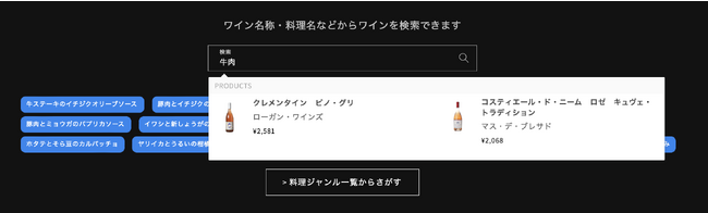 当社ECサイトのTOPページおよび検索ボックスから、具体的な料理名や食材などのキーワード検索からペアリング・マリアージュ候補となるワインをお探しできます。