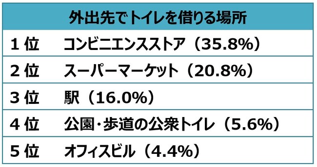 1.外出先でトイレを借りる場所1位「コンビニ」 2位「スーパー」 3位「駅」