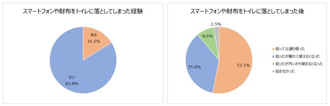 常に持ち歩いていることが多い財布やスマホ。トイレまで持って行って、落としてしまった経験について質問しました。経験があったのは約6人に1人の16.2%。その後、どうしたのかについては、「拾って元通り使った(53.1%)」が過半数という結果でした。拾ったものの使えなかった・使わなかったという回答のほか、そもそも「拾わなかった(2.5%)」という人も一定数いることが分かりました。