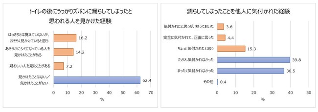 トイレ後にズボンを濡らしてしまった人を見かけたことがあるかという質問では、約4割の人が何かしらに気が付いていました。逆に自身について、他の人に気が付かれたかどうかを聞いたところ、「ちょっと気付かれたと思う(15.3%)」「完全に気付かれて、正直に言った(4.4%)」「気付かれたと思うが、黙っておいた(3.6%)」を合わせて、約2割の人は気付かれた可能性があると回答。自身についてよりも、他人がつけてしまったシミについて見かけたことがある人の割合が高いことから、自分が思っている以上にシミをつけてしまうとバレる可能性が高いことが考えられます。