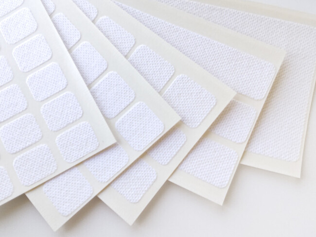 メリーケアテープは型抜き・角丸カット加工済みであるため、台紙から剥がすだけのワンタッチで手軽に使用できます。