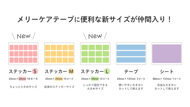 Merry Care Shop(所在地:愛媛県松山市)が販売する、イラストデザインを印刷・使いやすい大きさに型抜き加工した医療用テープ「メリーケアテープ」に、2023年5月6日(土)新たなサイズが加わりました。