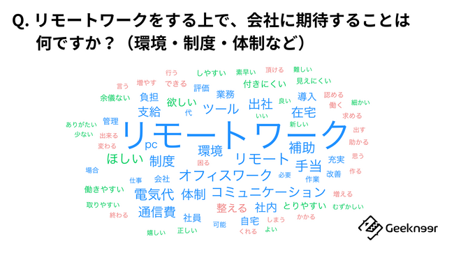 「Q. リモートワークをする上で、会社に期待することは何ですか?(環境・制度・体制など)」の質問では、1.リモートワーク補助・手当 2.柔軟な勤務形態・制度 3.円滑なコミュニケーションができる仕組み 4.評価・管理体制の適正化 についてのコメントが多く挙げられました。