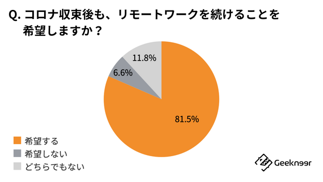 「Q. コロナ収束後も、リモートワークを続けることを希望しますか?」の質問では、8割以上のITエンジニアが「希望する」と回答しました。