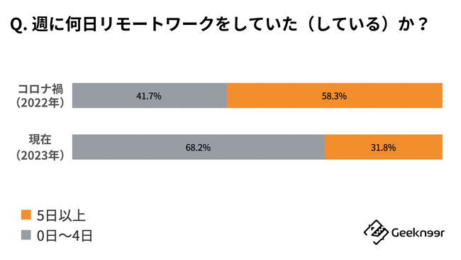 リモートワークの頻度をきく質問では、週に「5日以上」と回答したフルリモートワークのITエンジニアの割合が、コロナ禍(2022年)と現在(2023年)で、全体の6割から3割と、半減していることが分かりました。