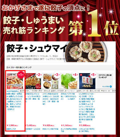 お取り寄せサイト「47CLUB」の「餃子・しゅうまい」部門では、通販限定食べ比べセットにてランキング第1位を獲得しました。