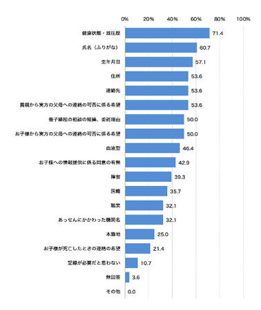 出自に関する情報については、実方の父母に関して記録を望む項目も養子・養親により違いが見られますが、「氏名」や「生年月日」、「健康状態・既往歴」や「子ども・養親から実方の父母への連絡の可否に係る希望」等が上位となっており、支援機関ではこうした項目を確実に記録していくことが求められています。