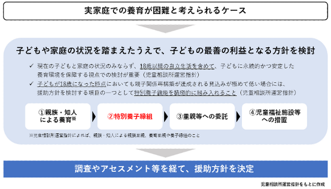 [1]児童相談所運営指針によれば、右図のとおり、援助方針を検討する項目の一つとして特別養子縁組を積極的に組み入れることが求められています。