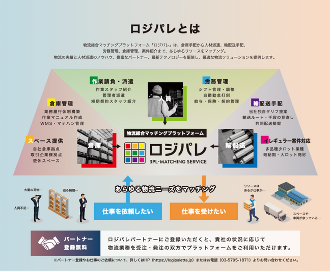 ロジパレとは物流派遣No.1の人材企業 『バイトレ』をルーツに持つ弊社の強みを活かし、業界特有の需給バランス、業務量の変動に対し、連携により解決を図る物流ビジネスマッチングプラットフォームです。