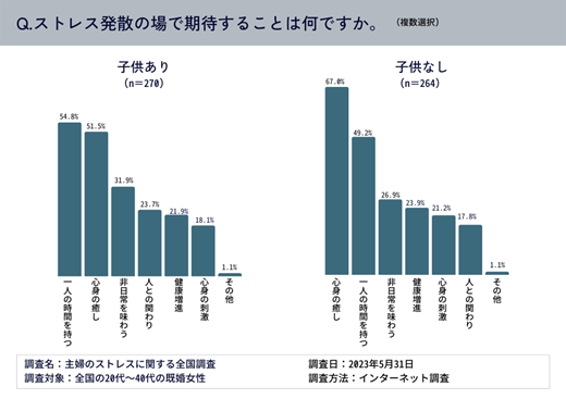 ストレス発散の場で期待することを聞いたところ、子供がいる既婚女性は「一人の時間を持つ(54.8%)」、子供がいない既婚女性は「心身の癒し(67.0%)」が第1位だった。「非日常を味わう」が3位となり、日常生活を忘れて、非日常を味わい、心身を癒したいと考える人が多いことがわかった。