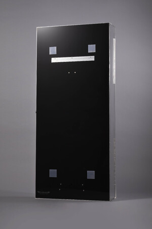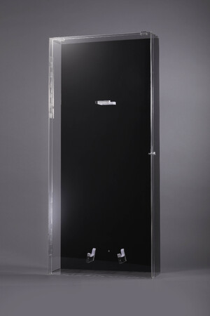 裏面には欧米の展示会で用いられることが多い壁にプレートをねじ止めした上で、上からはめ込む形式のスライド金具を採用しているため、比較的簡単かつ、安定した壁掛け設置が可能です。なおアクリルケース上部から25cmの位置にスライド金具が設置されております。