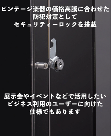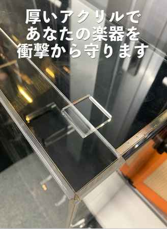 アクリルケース全体での重量は約12キロ。楽器を衝撃から守るための設計として、前面に厚さ5ミリの透明アクリル板を使用しております(バックには8ミリのブラックアクリルを使用)。また扉の上部が噛み合う設計になっており“重厚感のあるしっかりした作り”という印象を持っていただけるはずです。