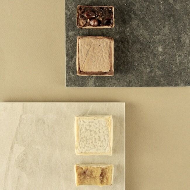 大粒の大納言小豆を発酵させて、世界中のトップパティシエに愛されつづけているヴァローナ社のカカオパウダーを贅沢に使った、ショコラ風味のつぶ餡。甘味はメープルシロップと甜菜糖。隠し味に、三重県のチョコレート香がする豆味噌をつかっています。時折感じるフランボワーズの香りと酸味がアクセント。あんこ菓子であることを忘れてしまうような仕上がりです。コーヒーや赤ワイン、ウイスキーと合わせてどうぞ。