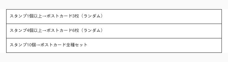 集めたスタンプの数により、受け取れる特典が変わります。特典は各クリエイターのイラストが印刷されたポストカードです。