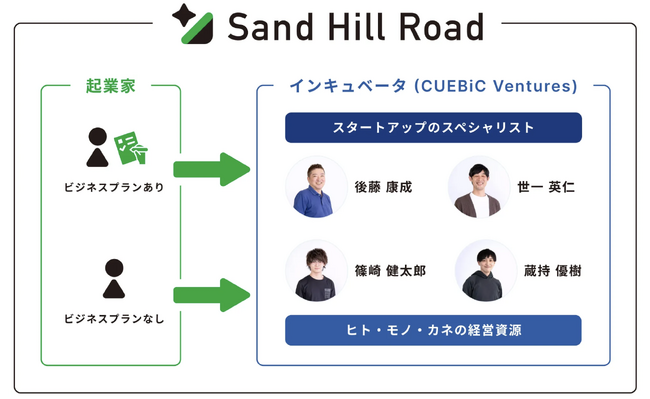 インキュベーションプログラムSand Hill Roadはビジネスプランを所有する起業家をキュービックベンチャーズの招き入れるEIR(客員起業家)制度となります。起業家が自身のビジネスプランを持ってキュービックベンチャーズにジョインしてもらい、キュービックベンチャーズの経営リソースの支援を受けながら事業を成長させていきます。