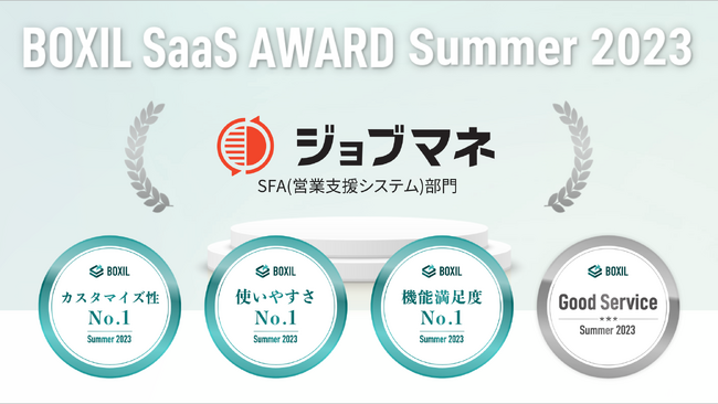 「ジョブマネ株式会社」(本社:沖縄県那覇市、代表取締役:小林康裕、以下「ジョブマネ」)が提供する「ジョブマネ」 は、スマートキャンプ株式会社(以下「スマートキャンプ」)が主催する「BOXIL SaaS AWARD Summer 2023」のSFA(営業支援システム)部門で「Good Service」「機能満足度No.1」「使いやすさNo.1」「カスタマイズ性No.1」に選出されました。