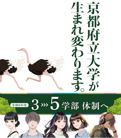 京都府立大学は、規模の小さな総合大学として分野を限定しつつも、時代が求める要請を踏まえ、令和6年(2024年)4月に3学部から5学部へ発展させる学部・学科の再編を行います。