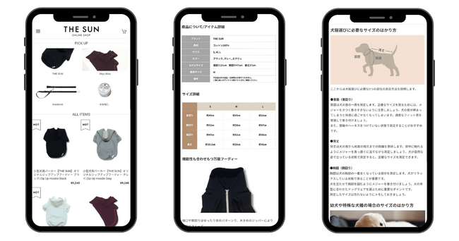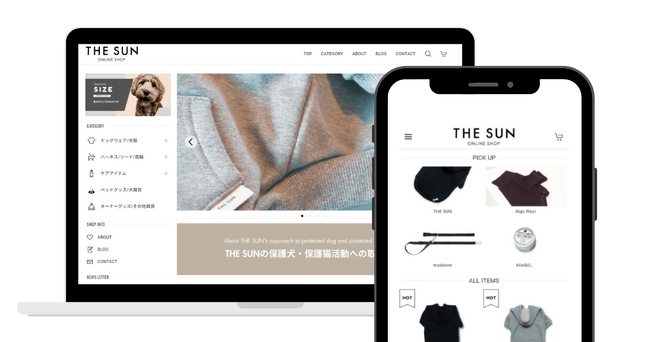 新しいECサイト「THE SUN ONLINE SHOP」では、ドッグウェアやハーネス/首輪、またケアアイテムなどのカテゴリーごとに商品検索できる機能の追加と、注目ブランドをレコメンドする“ピックアップ”をTOPページに設けました。