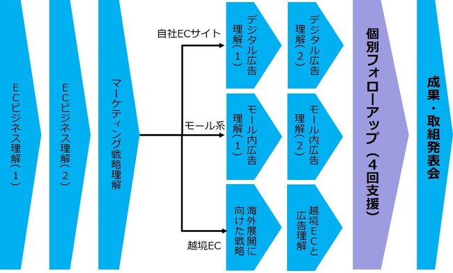 ・プログラムでは、ECビジネスの基礎理解から始まり、売上を向上させるのに不可欠なデジタル広告運用、売上分析などのテクニカルな部分まで一定程度内製化できるレベルを目指す。