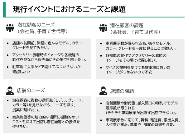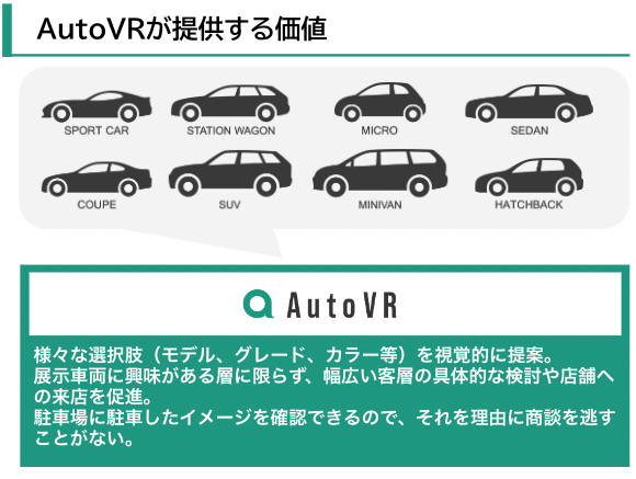 「AutoVR」は、最先端のVR技術を活用し、顧客がVR空間上で自動車の内装・外装、ボディーカラー、オプションの装着イメージ等を目の前に実車があるかのように体験することができるソリューションです。「AutoVR」を活用することで、顧客は展示イベントやポップアップストアなどで、気軽に自分の好みやニーズに合った車両を確認、検討することができます。他方、ディーラーは、車両展示に係る賃料や陸送等に係るコストを抑えることができます。 また、ショールームでは、顧客が希望する実車の在庫が無い場合であっても、顧客は展示車のカラーバリエーションや新型モデル車の内装・外装をVR空間で確認しながら、店舗スタッフに相談を行うことができます。自動車販売業に「AutoVR」を導入・活用することにより、顧客は従来より満足度の高い購入体験が可能となり、同時にディーラーはより低コストで効率的に 新しい顧客接点を創出することが可能になります。
