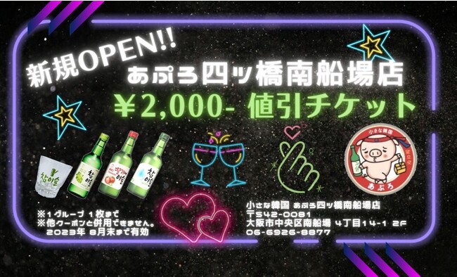 福岡の韓国料理店「小さな韓国あぷろ」の大阪・四ツ橋南船場店(所在地:大阪市中央区南船場4丁目、HP:https://apuro-minamisenba.com/、運営:(株)ff)が2023年7月4日にグランドオープンいたします。「小さな韓国あぷろ」は九州を中心に15店舗を展開する人気料理店です。大阪・四ツ橋南船場店で16店舗目、関西では2店舗目の出店となります。オープン記念キャンペーンで2000円割引チケットをプレゼント中です。