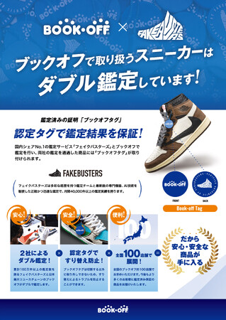お客様から商品を買取り後、累計100万件以上の鑑定数を誇るフェイクバスターズと日本最大リユースチェーンのブックオフがダブルで鑑定します。現在はNIKEを中心に鑑定していますが、今後鑑定可能ブランドを拡大する予定です。鑑定を通過した正規品には「ブックオフタグ」が取り付けられます。 「ブックオフタグ」は、切断する以外に取り外しができないため、すり替えによるトラブルを防止できます。 また「ブックオフタグ」が付いた商品は全国約100店舗でお買い求めいただけます。