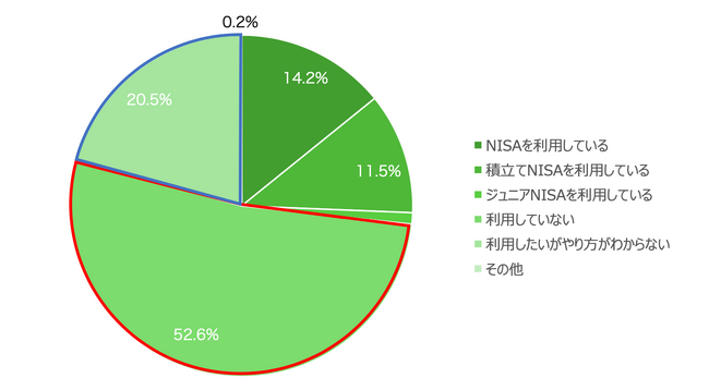 続いて、NISA、積立てNISA、ジュニアNISAの各利用状況を聞いたところ、それぞれ、「NISA(14.2%)」「積立てNISA(11.5%)「ジュニアNISA(1.1%)」という結果となり、3つのNISA全てを合わせても、「利用していない(52.6%)」を大幅に下回る結果となりました。