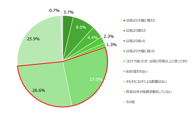 次に、年間で投資に活用する金額について、コロナ以前と比較して変化があったか聞いたところ、「あまり変わらない(27.0%)」「そもそもコロナによる影響はない(26.6%)」との回答が高く、合わせて5割以上の方は、コロナの影響がなく、年間の投資額もほぼ変わっていないということがわかりました。