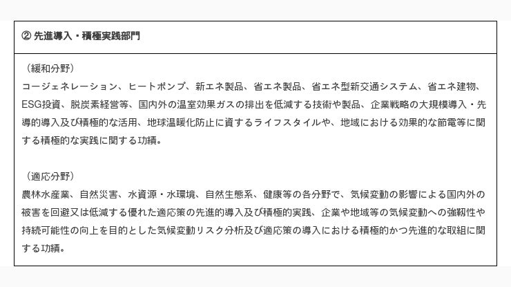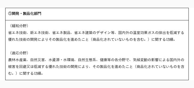 「気候変動の緩和(温室効果ガスの排出抑制対策)」及び「気候変動への適応(気候変動の影響による被害の回避・軽減対策)」に関し顕著な功績のあった個人又は団体(自治体、企業、NPO/NGO、学校等。共同実施も含む。以下同じ。)に対し、その功績をたたえるため、表彰を行う。