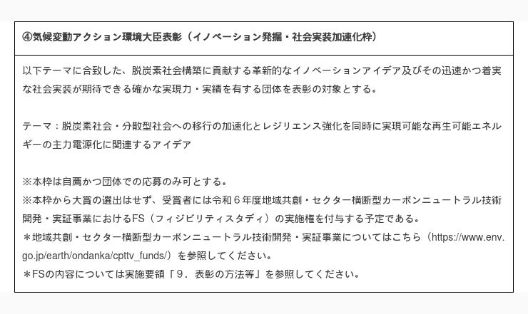 また、今般、我が国は2050年までに温室効果ガス排出量を実質ゼロとする、2050年カーボンニュートラル、脱炭素社会の実現を目指すことを宣言したところであり、この目標を達成するためには、優れたCO2排出削減技術の創出及び社会実装の加速化が不可欠であることから、本表彰に特別枠を設け、脱炭素社会構築に貢献するイノベーションの卓越したアイデアと、その迅速かつ着実な社会実装が期待できる確かな実績・実現力を有する者について表彰を行うこととする。
