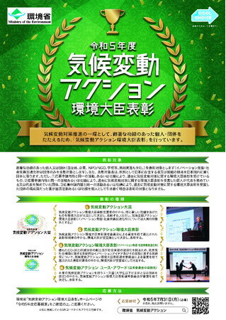 気候変動対策推進の一環として、顕著な功績のあった個人・団体をたたえるため、「気候変動アクション環境大臣表彰」を行っています。今般、受賞者選考に向けた募集を開始いたしましたので、御案内申し上げます。