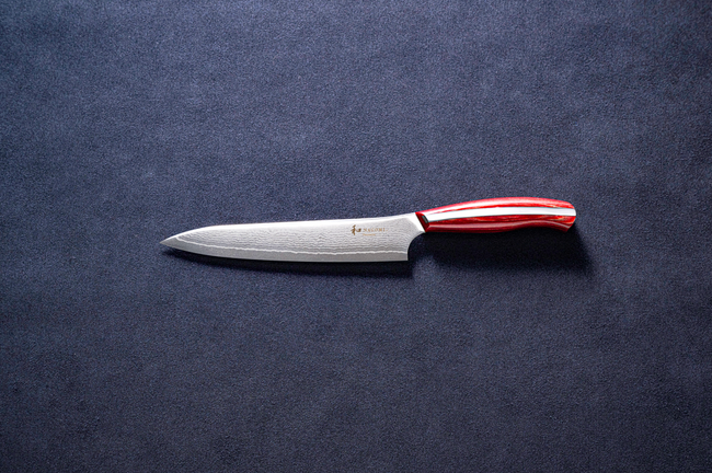 シンプルなダマスカス模様を纏ったこの包丁は、使うほどに愛着が湧いてきます。誰のためでもない自分だけの趣味に、思う存分、愉しむことのできる包丁です。