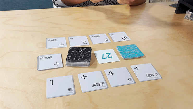 3. お題の数字になるように手札から1枚ずつ自分の前に出して計算式を作成していきます。
