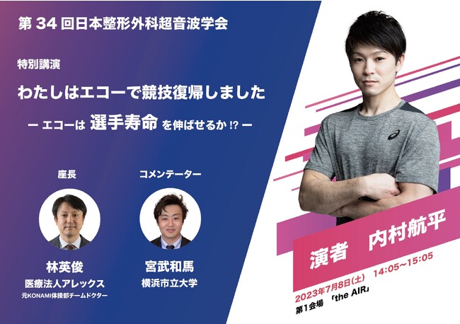 元プロ体操競技選手の内村航平さんに第34回日本整形外科超音波学会で特別講演においてご登壇いただきます。内村航平さんが実際にエコーを用いた治療を受け、競技復帰した経験や、スポーツ選手として自分の身体・怪我に対しての考えをお話しいただきます。また、報道関係者様のご参加も可能ですので、ぜひこの機会に取材もご検討いただけますと幸いです。