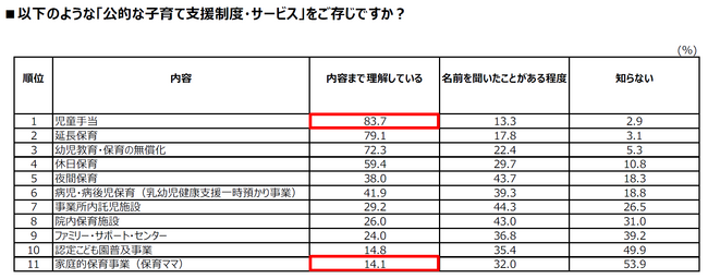 ○最も認知度の高い「児童手当」と、最も認知度の低い「家庭的保育事業(保育ママ)」では、「内容まで理解している」の占率に69.6ポイントの差が見られた。
