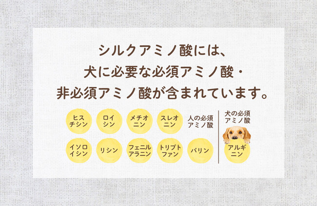 「アミノワン」は犬の体に必要な20種類のアミノ酸がすべて含まれているシルク(たんぱく質)を