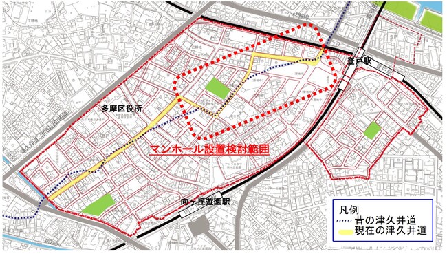 登戸で親しまれてきた歴史資源を未来に継承し、シビックプライドを育む取組の1つとして、沿道の既存マンホールを、津久井道の歴史を感じさせるデザインに更新するため、クラウドファンディングやデザイン案の公募を行います。
