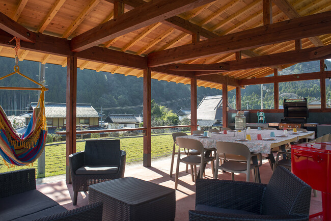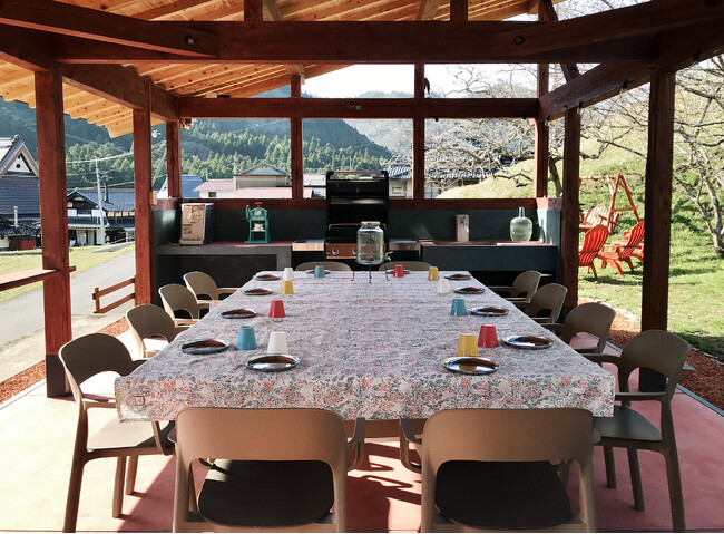山々に囲まれた高台に建つ木造バーベキューハウスでバーベキューを楽しんで頂けます。バーベキューハウスからは、ハンモックに揺られながら山村風景が眺められます。大自然の中でラグジュアリーなバーベキューを楽しんで頂くため、ウェーバー社の10人用BBQガスグリルをご用意致しました。炭要らずですので、バーベキューに不慣れな方にも簡単に本格的なバーベキューを味わって頂けます。また、大人12人が座れる大きな(卓球台にもなる)テーブル、4人掛けのガーデンソファ、ハンモック、電源など様々な設備を整えました。屋根付きのため、夏の暑い日差しや、急な雨にも安心です。