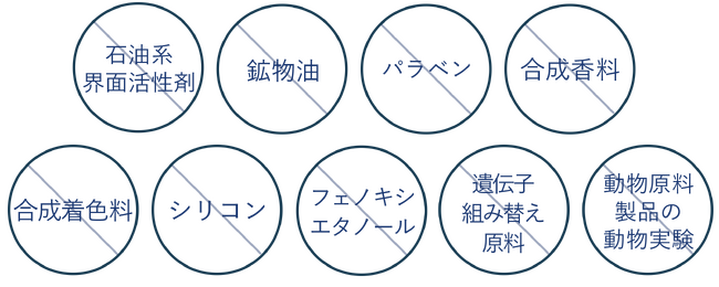 *ザクロオイル(ザクロ種子油)、タマヌオイル(テリハボク種子油)、オリーブ果実油、オレンジ果皮油、グレープフルーツ果皮油、ラベンダー油、カニナバラ果実油、ビターオレンジ花油、アルガニアスピノサ核油、ホホバ種子油。
