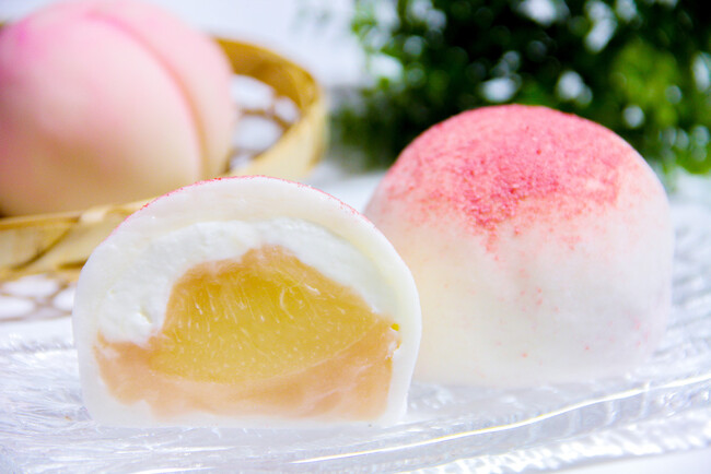 プレミアム大福シリーズの中でも人気No.1の商品、夏季限定「白桃大福Premium」。山形県産の果汁たっぷり白桃、芳醇な生クリーム、自家製桃あんをマシュマロのようにふわふわな大福餅で包み、仕上げにいちごパウダーをまぶしました。ピンクの見た目もかわいく華やかな「白桃大福」は、贈り物にも大変喜ばれるお菓子です。