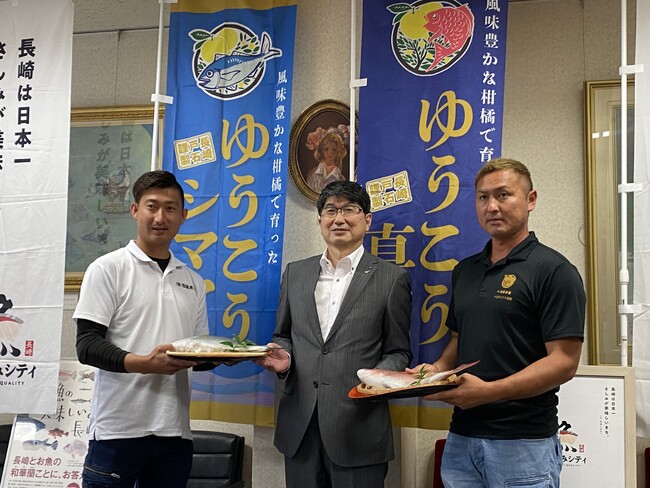 (中の方)田上元長崎市長(右の方)雄昇水産の西本社長(左の方)昌陽水産の長野社長