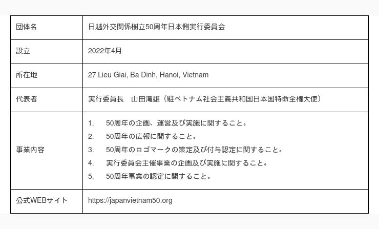 公式Facebook:https://www.facebook.com/japanvietnam50