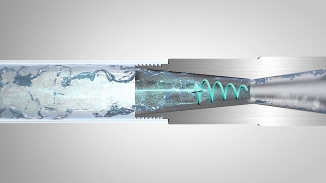 ナノバブル発生メカニズムは水がナノセレブ(R)ノズルを一定の水圧にて通過する際、特許取得技術のキャビテーション方式で旋回流(トルネード回転)を起こし、水道水に含まれている約2%の空気(溶存酸素)を微細バブル化し、ナノバブルが発生します。