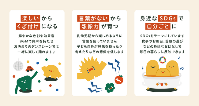 ノンバーバルなので、まだ言葉が理解できない乳幼児にも楽しめることはもちろんのこと、キャラクターの表情や行動から想像力や興味の向上を促進。さらに、「“SDGs”がまだよく理解できていない」「子どもに教えたいけど学ぶ時間がない」という大人にとっても、身近な事例からSDGsを“自分ごと”として理解しやすい内容となっています。
