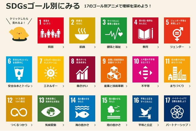 ユニバーサルデザインへの取組み自体が多くのSDGs目標に繋がっており、子どもたちは、このアニメーションを通してSDGsを学ぶと同時にユニバーサルデザインについても学ぶことができます。