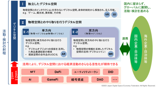 今回、デジタル空間での新しい経済発展に資することを目的に、日本のみならずグローバルな交流が行われる「WebX」への後援に至りました。当連盟は、いわゆるメタバースだけではなく、「デジタル空間」を以下の図のような広い概念として捉え、活動の射程に入れています。