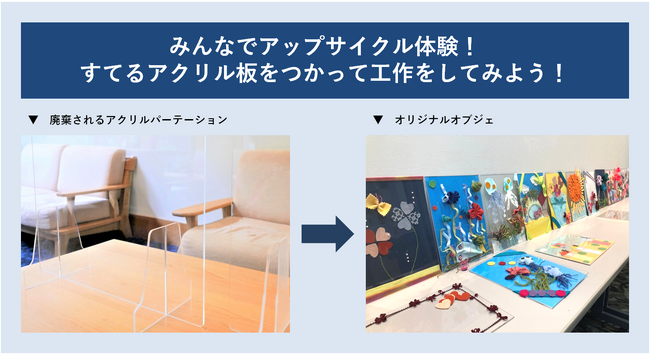 リダクションテクノでは、体験型ワークショップとして本来は捨てられるはずだった素材や、不要になったけれど捨てるにはもったいないサンプル品を使ったオブジェ作りを実施します。カラフルな布やリボンを自由に組み合わせて、オリジナル作品を作っていただきます。この材料に使用するのは、企業での役目を終えたアクリルパーテーションや生地サンプルです。本当は価値があっても廃棄されてしまうものはたくさんあります。不要になったものを捨てるのではなく、新たな価値を見出して資源を再利用する「アップサイクル」を体験いただきます。