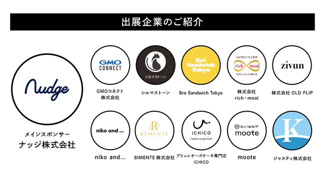 左からナッジ株式会社/GMOコネクト株式会社/シルマストーン/Bro Sandwich Tokyo /株式会社rich・meal/株式会社OLD FLIP/nikoand.../BIMENTE株式会社/iCHICO/moote/ジャスティ株式会社