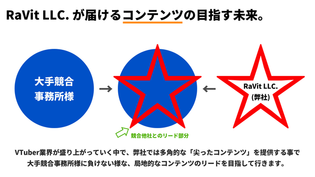 ※【すいすと】の様に『よりニッチな層』にコンテンツを届ける事により、競合事務所様と比べても遜色のないコンテンツを目指してまいります。(※資料2 RaVit LLC.が届けるコンテンツの目指す未来。)